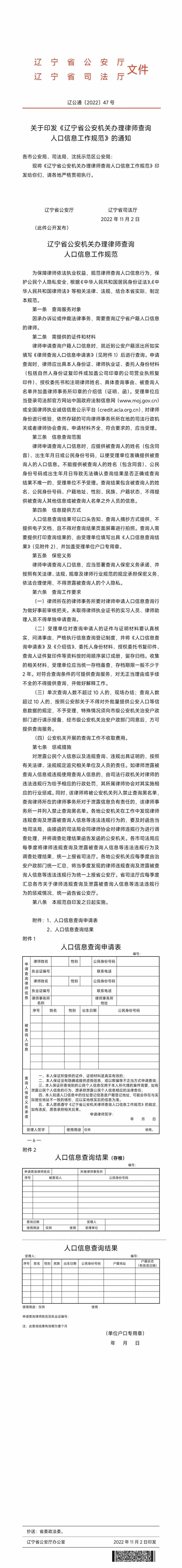 关于印发《辽宁省公安机关办理律师查询人口信息工作规范》的通知