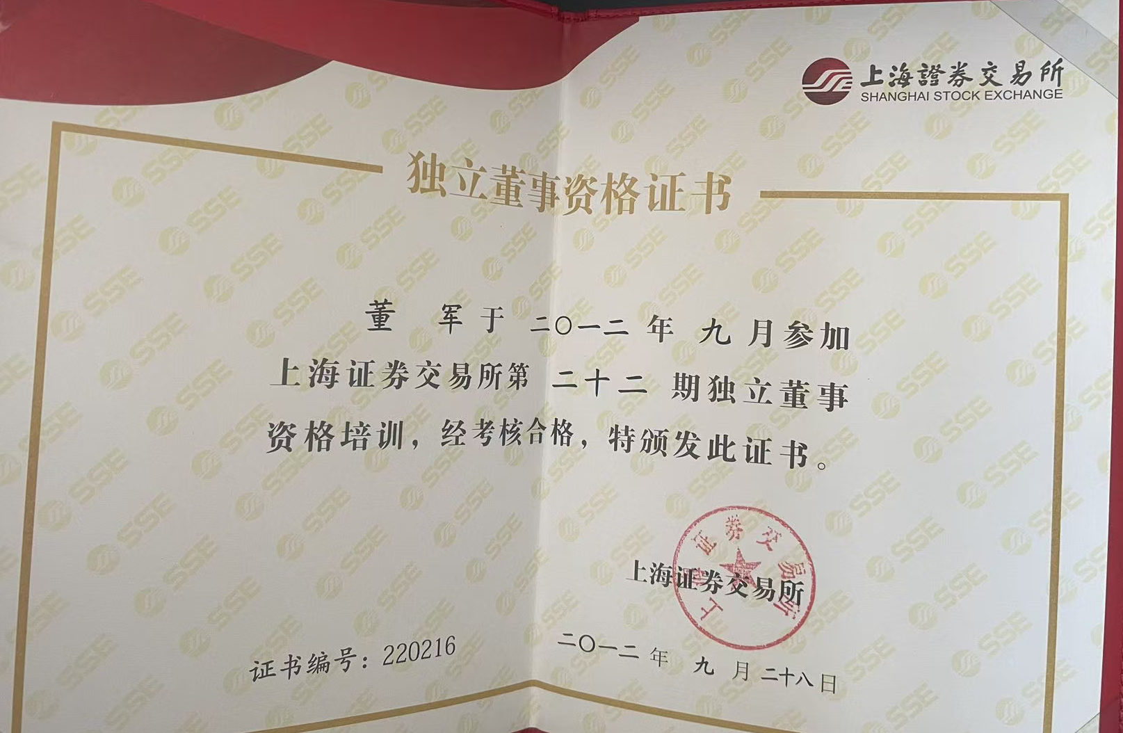 2012年9月 考取独立董事资格证书